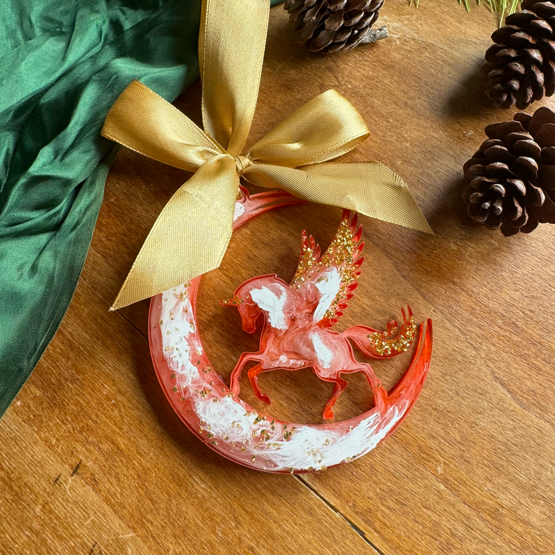 Porta un’atmosfera magica nelle tue feste con questa decorazione natalizia unica: un unicorno alato che danza su una luna scintillante 🌙🦄. Realizzata interamente a mano in resina epossidica, ogni creazione è impreziosita da glitter e dettagli che la rendono irripetibile.
